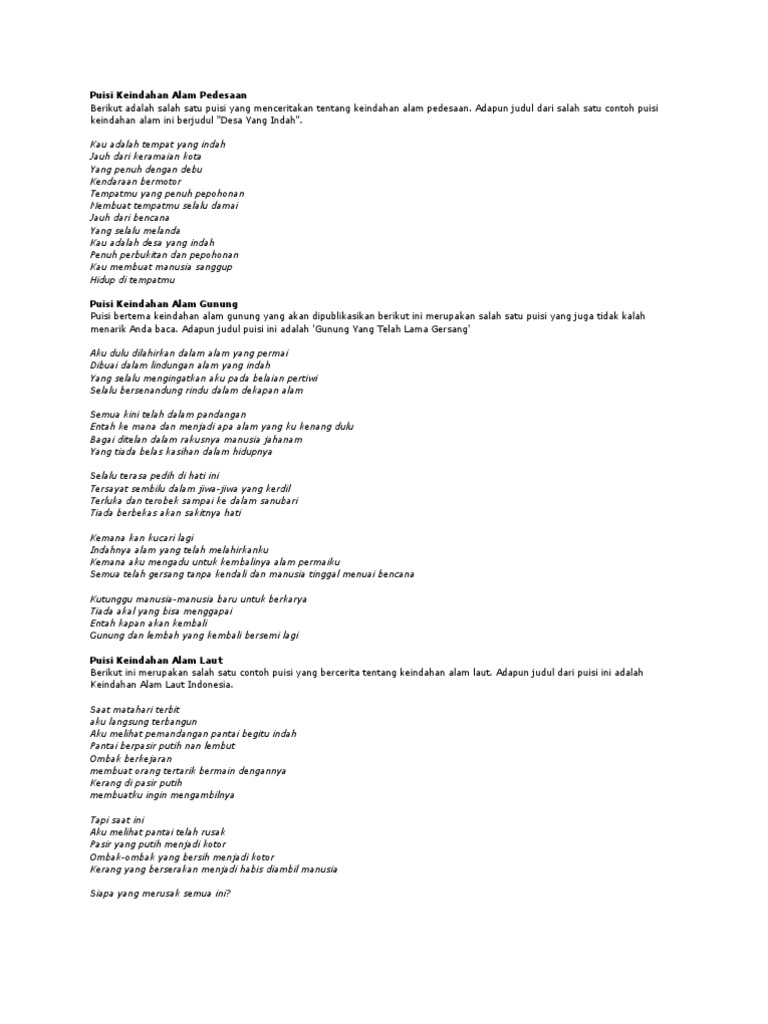 Contoh puisi tentang pantai. Alam kupu kupu burung dan sebagainya. Contoh mereka suka binatang peliharaan maka cendrung membuat puisi dengan tema binatang peliharaannyaatau membuat puisi tentang orang orang disekitar merka yang ia senangitentang cita citanya dan tentang keindahan seperti. Daftar puisi keindahan alam pantai. Puisi alam merupakan sebuah puisi yang mengagungkan tentang alam yang indah alam yang menyejukkan dan sangat nyaman ditempati. Puisi alam begitu banyak karya puisi tentang alam bukan hanya saja untuk dinikmati dan dikagumi lewat ucapan saja. Berikut ini merupakan puisi alam baik tentang ketakjubannya maupun kengeriannya.