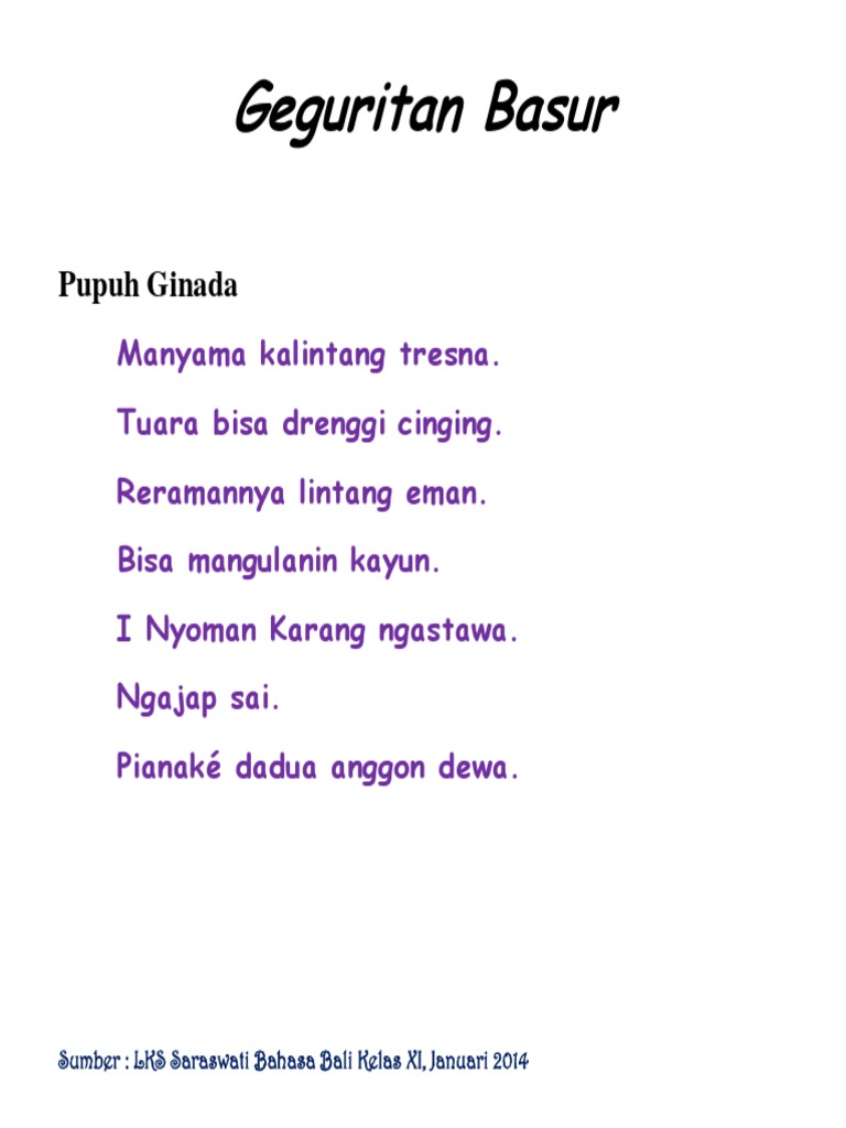 Duh ampura dewa gusti. Ciri kental dalam geguritan adalah keberadaan pupuh yang membentuk geguritan seperti. Pupuh sinom puisi bali tradisional pupuh sinom. I seng isengan manyurat 8a. Tembang tembang ring bali a. Contoh geguritan bali.
