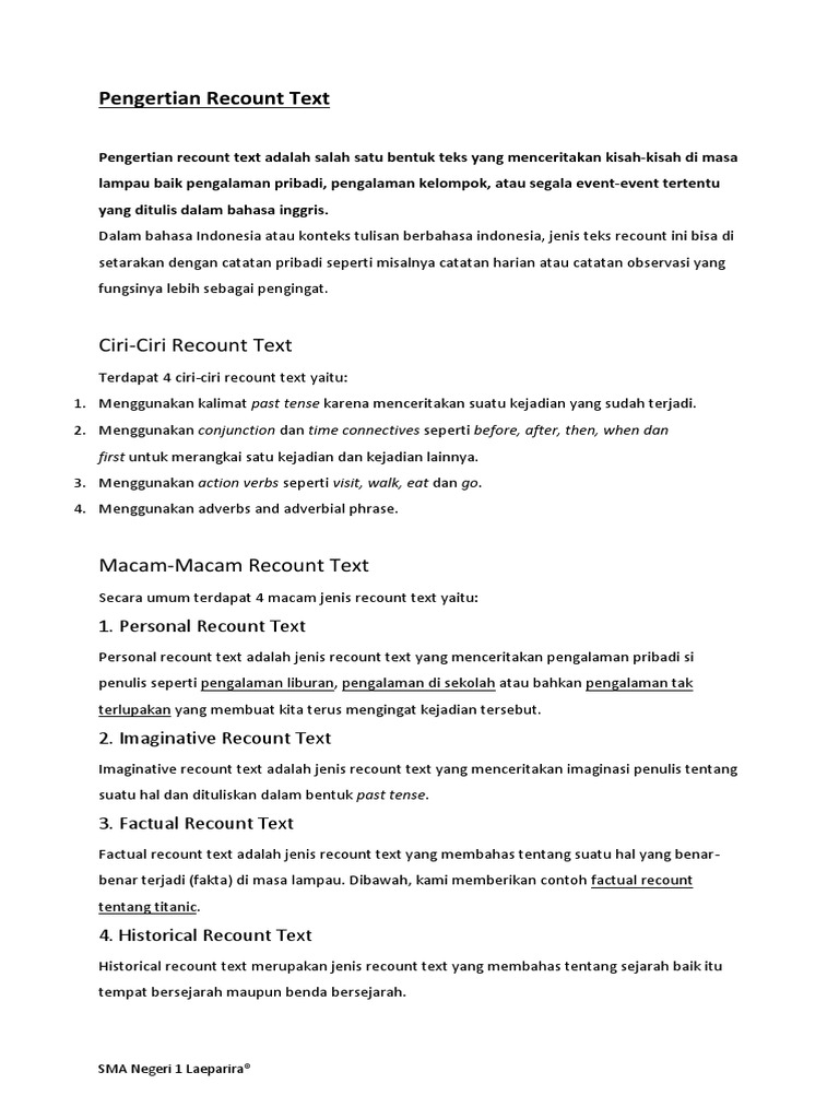 Mari kita pahami terlebih dahulu pengertian dari recount text ciri khas recount text dan jenis jenis recount text yang ada dalam bahasa inggris. Mohon maap atas kesalahan dan kekurangan dalam tulisan kali ini mudah mudahan artikel yang panjang ini tidak membosankan bagi sobat untuk membaca nya sampai akhir. Bagi sobat yang ingin mengetahui pembahasan tentang text recount mulai dari pengertian purpose social funtion dan generic structurenya silahkan klik di sini. Berisi kumpulan contoh recount text pendek pengalaman tak terlupakan pengalaman buruk liburan ke pantai ko yogyakarta bali liburan di rumah for junior high school lengkap dengan generic structure. 6 contoh recount text tentang pengalaman pribadi yang tak terlupakan dan artinya 5 contoh recount text pengalaman hidup biography contoh recount text for senior high school dan junior highschool contoh recount text holiday idul fitri 25 contoh pengalaman pribadi pendek dan artinya dan 18 contoh narrative text. Entah itu kenangan bersama sahabat.