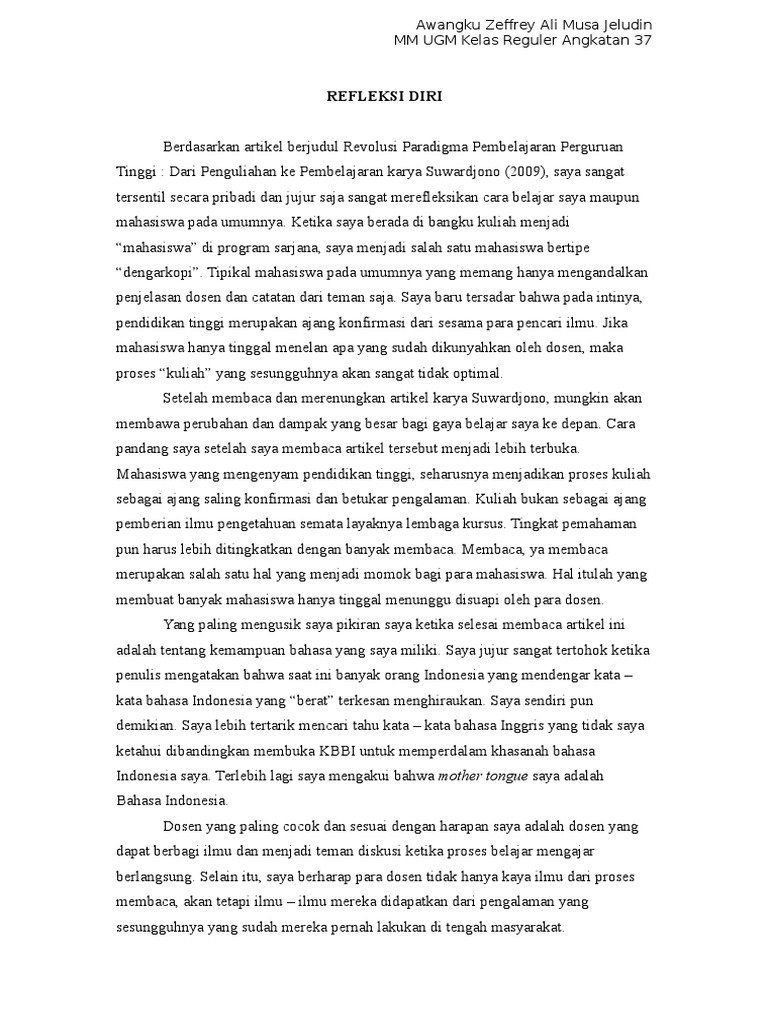 Contoh refleksi diri mahasiswa. Susanto zuhdi yang pada setiap perkuliahan selalu dengan piawai menyampaikan konsep konsep dalam ilmu sejarah. 3 juni 2013 2106 diperbarui. Ahmad khoiron nashirin nim1112103000079 tugas refleksi diri kekurangan diri saya dalam modul cellular and. Jumlah kata untuk refleksi diri awal ini berkisar antara 300 500 kata. Jadi refleksi tahun pertama sebagai mahasiswa dimulai dari sini. Pilihan yang tidak mudah.