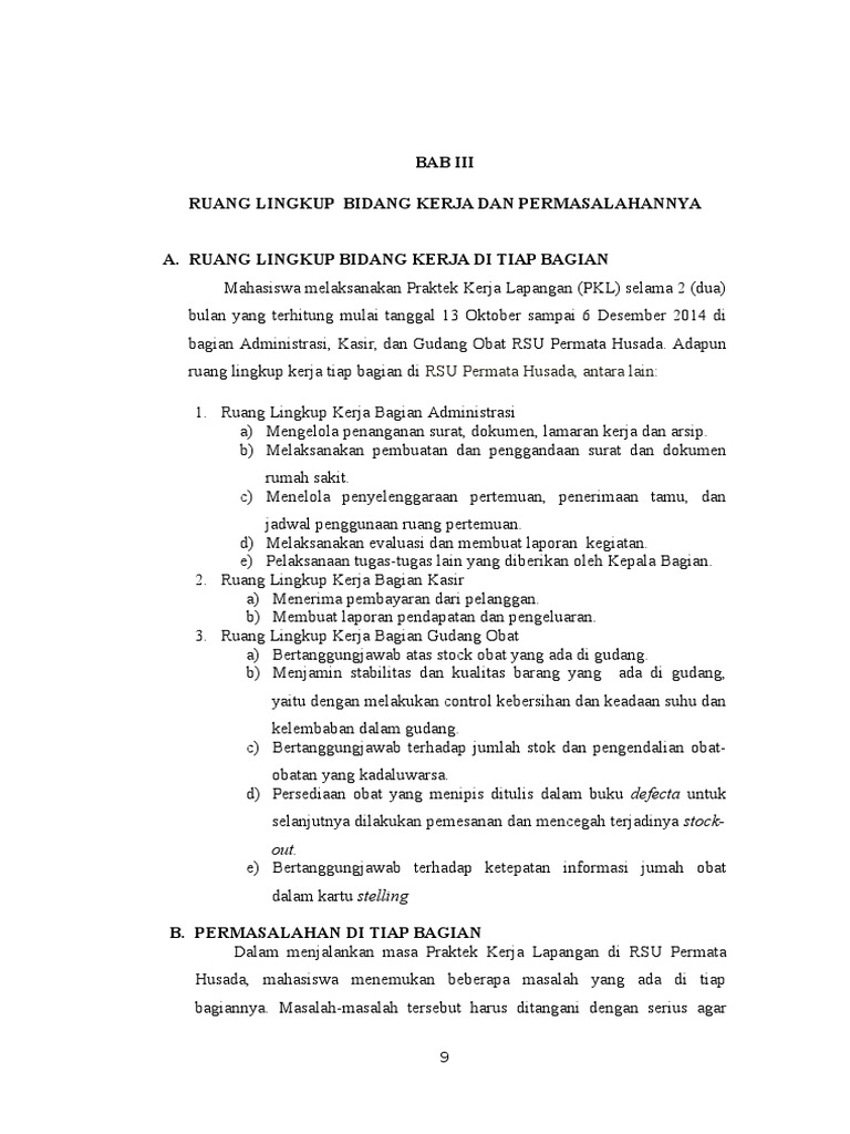 Ruang lingkup dari pelaksanaan praktek kerja lapangan ini dilakukan penulis di sma swasta tunas bangsa balam. Pendahuluan pada bab ini penulis menguraikan latar belakang masalah perumusan masalah tujuan dan manfaat penelitian ruang lingkup pembahasan metode penulisan dan sistematika penulisan. 14 ruang lingkup praktek kerja lapangan dalam laporan pkl ini penulis hanya membahas tentang bagaimana cara pembuatan kartu pkbl program kemitraan dan bina lingkungan yang dimana sudah terkomputerisasi namun masih menggunakan microsoft office excel. Pt trans marga jateng tmj. Telah sesuai dengan tata ruang terpadu yang disusun oleh pemerintah provinsi jawa tengah dan diharapakan dapat mempercepat pengembangan wilayah tersebut. Sistematika penulisan laporan kerja praktek ini adalah sebagai berikut.