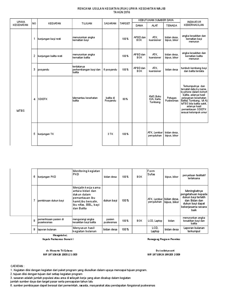 Rencana rencana ini tentu saja seharusnya berada dalam perencanaan puskesmas ruk dan rpk agar bila dalam rencana ini dibutuhkan anggaran minimal tahun depan realisasi anggaran untuk rencana rencana ini bisa terwujud. Tujuan tahap dan ruang lingkup perencanaan tingkat puskesmas sesuai keputusan menteri kesehatan republik indonesia nomor 128menkesskii2004 tentang kebijakan dasar puskesmas kementerian kesehatan menerbitkan beberapa buku pedoman manajemen puskesmas yang terdiri dari 3 seri buku yaitu buku seri 1 pedoman perencanaan tingkat puskesmas. Rpk dimungkinkan untuk dirubahdisesuaikan dengan kebutuhan saat itu apabila dalam hasil analisa pengawasan dan pengendalian kegiatan bulanan dijumpai kondisi tertentu bencana alam konflik kejadian luar biasa perubahan kebijakan mendesak dll yang harus dituangkan. Tersusunnya rencana usulan kegiatan ruk puskesmas untuk tahun berikutnya dalam upaya mengatasi masalah atau sebagian masalah kesehatan masyarakat. I pendahuluan latar belakang tujuan bangsa indonesia sebagaimana yang tercantum dalam pembukaan uud 1945 alinea 4 adalah untuk melindungi segenap bangsa indonesia dan seluruh tumpah darah indonesia dan untuk memajukan kesejahteraan umum dan mencerdaskan kehidupan bangsa. Sesuai dengan harapan dari pmk 442016 yang meminta disusunnya ruk dan rpk pada awal tahun maka pertanyaan saya rutin dalam tiap kali survei adalah apakah puskesmas sudah menyusun rencana usulan kegiatan dan rencana pelaksanaan kegiatan.