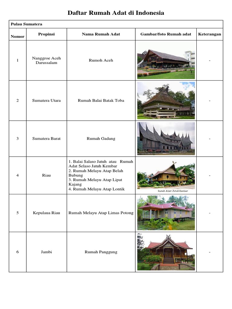 Minimal kita mengetahui nama nama rumah adat dan tempat asalnya. Rumah adat indonesia sebagai masyarakat indonesia tentu kita mengetahui bahwa negara kita tercinta ini memiliki berbagai adat dan budaya yang sangat menakjubkan dan tidak pernah dijumpai di negara lain. Begitu juga dengan rumah tradisonal daerah di indonesia di setiap provinsi memiliki begitu banyak macam rumah adat. Rumah limas adalah rumah adat di indonesia khas sumatra selatan yang memiliki lantai bertingkat dengan bentuk atap yang menyerupai limas. Rumah adat di indonesia begitu luas tentunya memliki banyak kekayaan alam keberaneka ragam agama suku budaya dan adat istiadat. Oleh karena itu mari kita lihat dibawah ini kumpulan gambar rumah adat indonesia yang berisi.