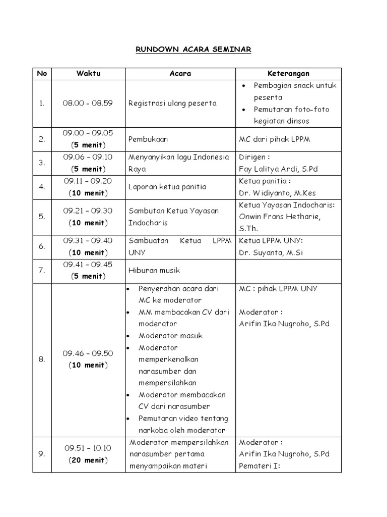 Contoh rundown acara seminar. 2 2 pembukaan mc. 2 0 08. Contoh rundown acara seminarworkshop dapatkan link. Kamis 24 nopember 2016. Namun susunan acara itu disesuiakan dengan jenis acara yang diadakan dengan menambahkan susunan acara yang dirasa perlu. Demikian seminar nasional hari inimarilah kita tutup acara ini bersama sama dengan membaca hamdallah.