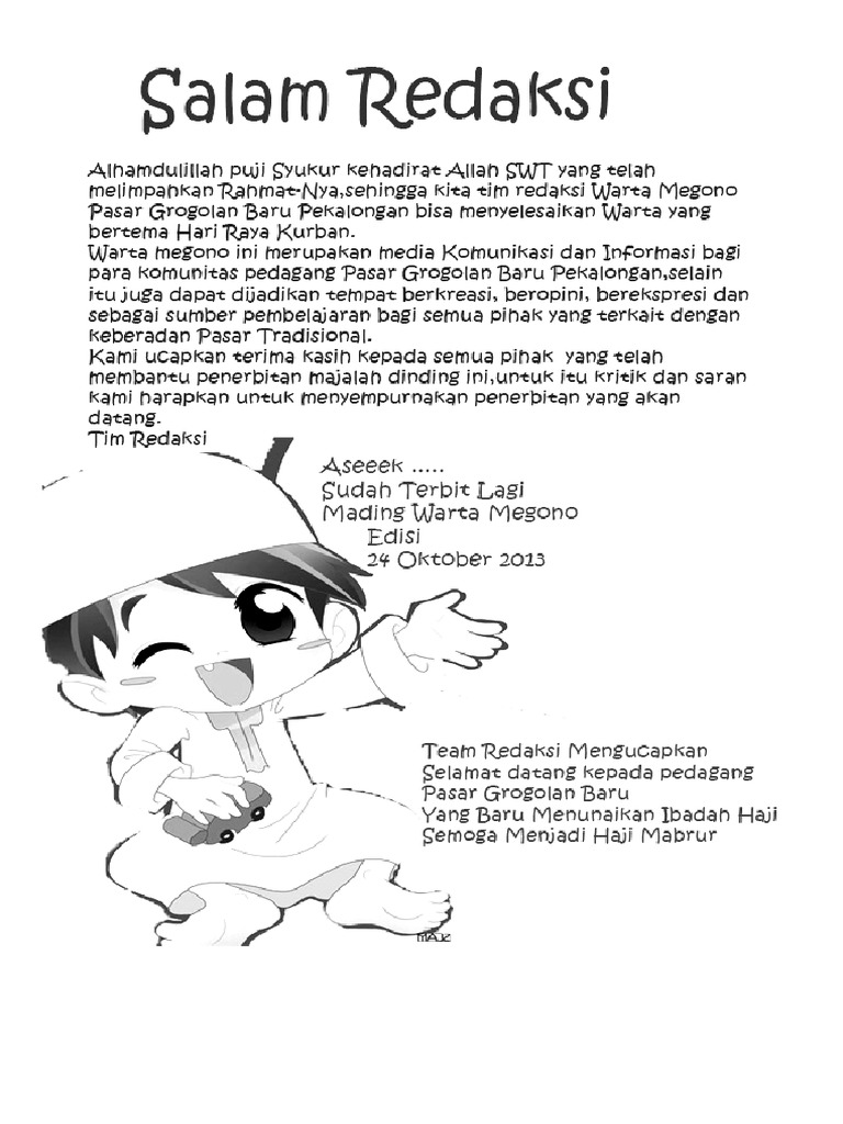 Kamu bisa menampilkan sebuah artikel atau essay pendek pada rubrik ini. Yang telah melimpahkan begitu banyak rahmat nya sehingga dapat terselesaikannya buletin ini. Halo kali ini yuuzu akan membahas mengenai contoh salam redaksi majalah dinding. Alhamdulillah puji allah swt. Nah itu contoh salam redaksi yang bahasanya tidak formal tapi lebih terkesan anak muda dan terlihat akrab.