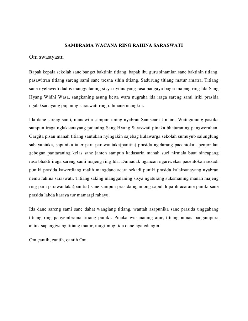 Ring subha déwasa sané mangkin patut atur uningayang titiang mangda para undangan pawikan mungguing sang sané jagi mawiwaha mangkin ipun sané kapurusa mawasta i kadek widiantana ipun sané mangkin makarya pinaka dosén honorér ring kampus ihdn denpasar alaki rabi ring ipun sané predana mawasta ni wayan apriani ipun pinaka dosén tetap ring stkip agama hindu amlapura. Sambrama wacana ring postingan niki maksud ne ritatkala wenten upacara saraswati nah kan wenten nika sambutan akidik saking kepala sekolah utawi guru kelas. Angayu bagia pisan aturang titiang majeng ring ida sang hyang widhi wasa utawi tuhan yang maha esa duaning asung kerta wara nugraha ida titiang prasida iriki jagi ngaturang sambrama wacana tur prasida iraga mapulpul iriki nyarengin indik pembukaan pesta kesenian bali pkb duk 9 september 2015. Sambrama wacana ketah mangge ring acara sajabaning. Lugrayang titiang sane pinaka reraman ipun nunah galah akidik anggen titiang nyihnayang pianak titiang sane pacgng ngelanturang upakara pawiwahan puniki. 1 sembrama wecana tutur lisan mateges nyembrama tamiu antuk bebaosan lisan nenten ngwacen naskah.