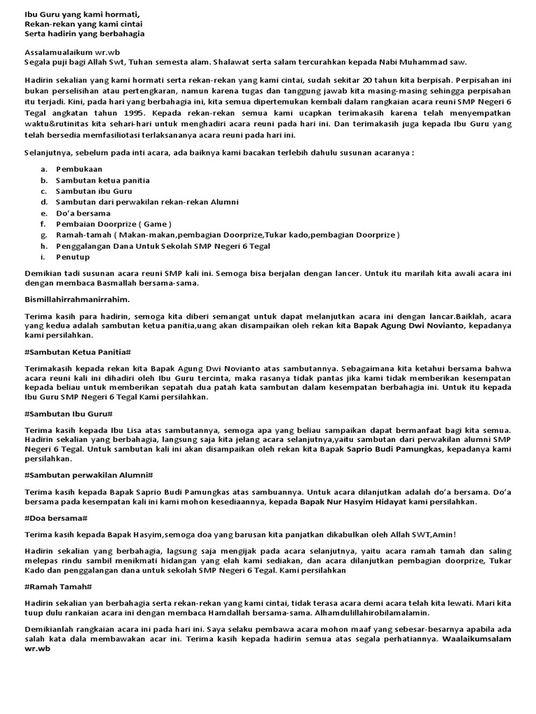 Telah lama kita tak jumpa. Ketika kegiatan acara wisuda pastinya ada moment dimana ada sambutan dari perwakilan mahasiswa dan biasanya yang akan mewakili memberikan sambutan adalah dari. Sambutan ketua panitia maulid nabi muhammad saw griya tiara asri 2. Untuk memberikan kemudahan bagi anda ketika disuruh berpidato dalam acara reuni tersebut maka untuk itu kami mencoba memberikan sebuah contoh pidato untuk acara reuni bagi anda. Sambutan merupakan bagian yang wajib ada dalam sebuah pidato singkat. Contoh kata sambutan kita tentunya sudah pernah menghadiri suatu acara baik itu formal atau nonformal nah dalam suatu acara tersebut banyak sekali kita lihat kata sambutan yang biasanya disampaikan oleh tokoh penting dalam suatu acara tersebut misalkan acara perpisahan sekolah biasanya akan ada kata sambutan dari kepala sekolah.