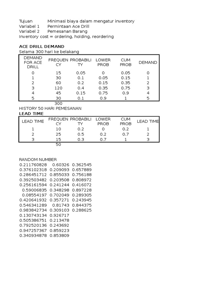 Metode monte carlo merupakan metode dimana kita men generate banyak percobaan simulasi untuk mendapatkan expected value nilai harapan dari suatu peubah acakdi dalam simulasi ini kita men generate angka random dari suatu distribusi yang kita tentukan di awalmonte carlo dahulu sering digunakan dalam permainan judi casino karena membantu dalam memprediksi suatu nilai. Pada bidang manajemen proyek simulasi monte carlo dapat mengkuantifikasi akibat akibat dari resiko dan ketidak pastian yang umum terjadi dalam jadwal dan biaya sebuah proyek. Disimpan dalam persediaan toko itu bermaksud menentukan berapa banyak roti yang harus dipesan setiap hari agar keuntungannya maksimal diasumsikan bahwa semua roti yang tidak terjual pada hari itu tidak dapat dijual kembali pada hari. Tulisan ini menggunakan metode monte carlo dapat menyelesaikan permasalahan dengan sampling dari proses bilangan acak random number. Berikut data panggilan diterima selama 100 hari untuk penggantian aki darurat pada malam hari diatas jam 12 malam. Dasar simulasi monte carlo adalah percobaan pada unsur peluang atau bersifat probabilistik dengan menggunakan pengambilan sampel secara acak.