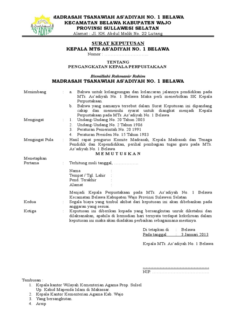 1 satu lembar. Y m viii 201 6 tentang pengangkatan kepala mts madinatunnajah perio. Tahun pelajaran 20172018 ketua yayasan dharma wanita kudi. Pengangkatan kepala kelompok bermain melati. Demikian surat keputusan ini dibuat dan disampaikan kepada yang bersangkutan untuk dilaksanakan dengan sebaik baiknya. Kop surat surat keputusan nomor.