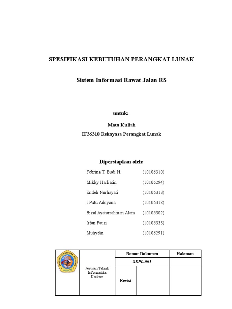 Husna alliyus dwi k j3d111094 program keahlian teknik komputer institut pertanian bogor jl. Isi dari dokumen ini sebagian besar adalah terjemahan dari dokumen ieee std 830 1993. Sebagai salah satu syarat untuk memperoleh gelar sarjana komputer fakultas sains dan teknologi universitas islam negeri syarif hidayatullah jakarta oleh. Kumbang no14 nomor dokumen program keahlian teknik komputer diploma institut pertanian bogor halaman skpl sinm 122. Dokumen ini akan berisi spesifikasi kebutuhan perangkat lunak skpl atau software requirement specification srs untuk srm sistem rental mobil. Ashary gumelar j3d211145 2.