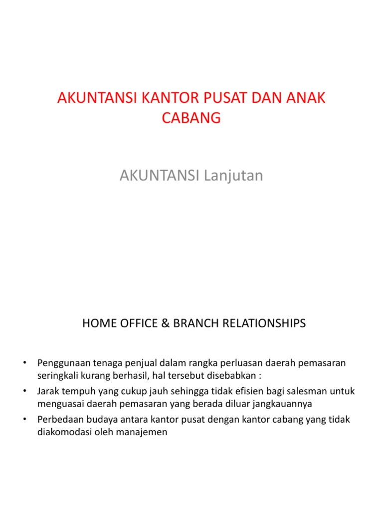 Hubungan cabang dan pusat. Hubungan kantor pusat dan cabang ii akuntansi keuangan 11 latar. Bekerjanya suatu cabang diantaranya adalah. Kantor pusat di kota a mengirimkan barang dagangannya ke kantor cabangnya di kota b dengan harga pokok rp. Contoh soal laporan keuangan kantor pusat dan kantor cabang admin. 842 am akuntansi rekonsiliasi.