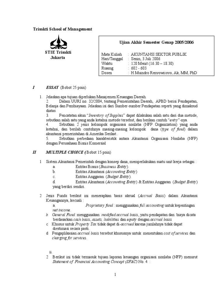 Contoh soal akuntansi sektor publik. Contoh dana perimbangan dari sektor pajak yang diterima pemerintah daerah adalah pajak hotel pajak restoran pajak hiburan pajak parker pajak reklama dan lain lain. Untuk soal nomor 1 sampai dengan 60 pilihlah satu jawaban yang pali. Klik di sini untuk informasi file lengkap contoh artikel akuntansi sektor publik selengkapnya. Berikut adalah kunci jawaban soal latihan mandiri akuntansi sektor publik eksi4207 untuk itu buka kertas yang berisi jawaban yang sudah anda kerjakan silahkan periksa jawaban anda dan cocokan dengan kunci jawaban. Kumpulan soal essay akuntansi sektor publik beserta jawaban edit. Setelah anda mengerjakan soal latihan mandiri akuntansi sektor publik eksi4207 universitas terbuka yang berisi 40 soal pilihan ganda.