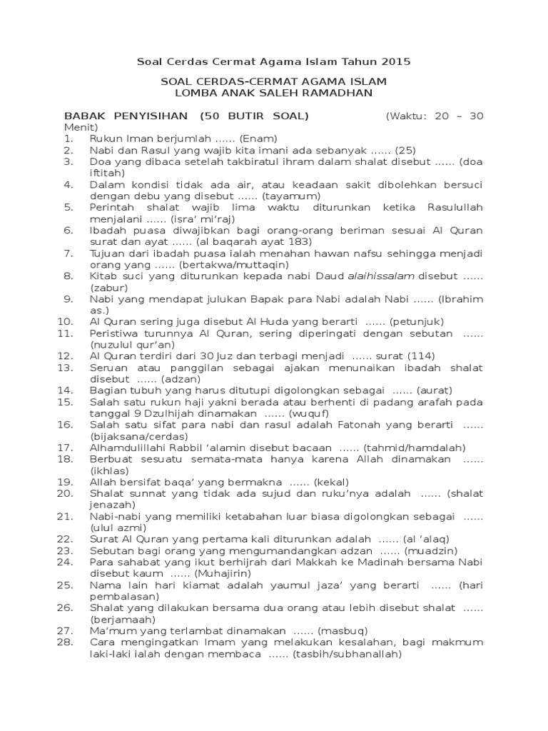 Home unlabelled kumpulan soal cerdas cermat agama islam. Soal cerdas cermat agama islam 2019 ini adalah salah satu hal yang wajib kamu tahu dimana admin blog soal kunci jawaban menyampaikan soal cerdas cermat agama islam 2019 kepada teman teman semua yang saat ini mencari soal cerdas cermat agama islam 2019 dengan ini maka kamu akan tahu selengkapnya pembahasan soal cerdas cermat agama islam 2019 tersebut. Soal soal cerdas cermat islami p a n d u a n. Contoh soal lomba cerdas cermat agama islam bisa di download pada link dibawah dalam format file dokumen word. Contoh tauladan yang baik cepat tepat 1. Contoh soal lomba cerdas cermat agama islam belajar ibadah agama islam.