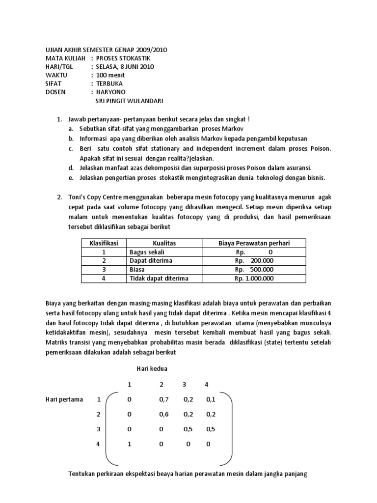 Contoh soal dan jawaban analisis markov. Analisis struktur organisasi dan desain organisasi untuk meningkatkan efektifitas organisasi pada kkt sari rejeki desa pulosari kecamatan kebakkramat kabupaten karanganyar mochamad muchson unp. Bank soal kelas 8 smp k2013 tentang sistem koordinat soal pilihan ganda soal 1 perhatikan gambar di bawah inianalisis kesalahan dalam penyelesaian soal matematika berbasis timss materi dan lks matematika kelas 8 sistem koordinat mgmp matematika. Contoh soal matrik transisi pada rantai markov11 slideshare uses cookies to improve functionality and performance and to provide you with relevant advertising. Probabilitas transisi adalah sebagai contoh pergantian yang mungkin dilakukan oleh konsumen dari satu merk ke merk yang lain. Save save contoh soal markov chain for later. If you continue browsing the site you agree to the use of cookies on this website.