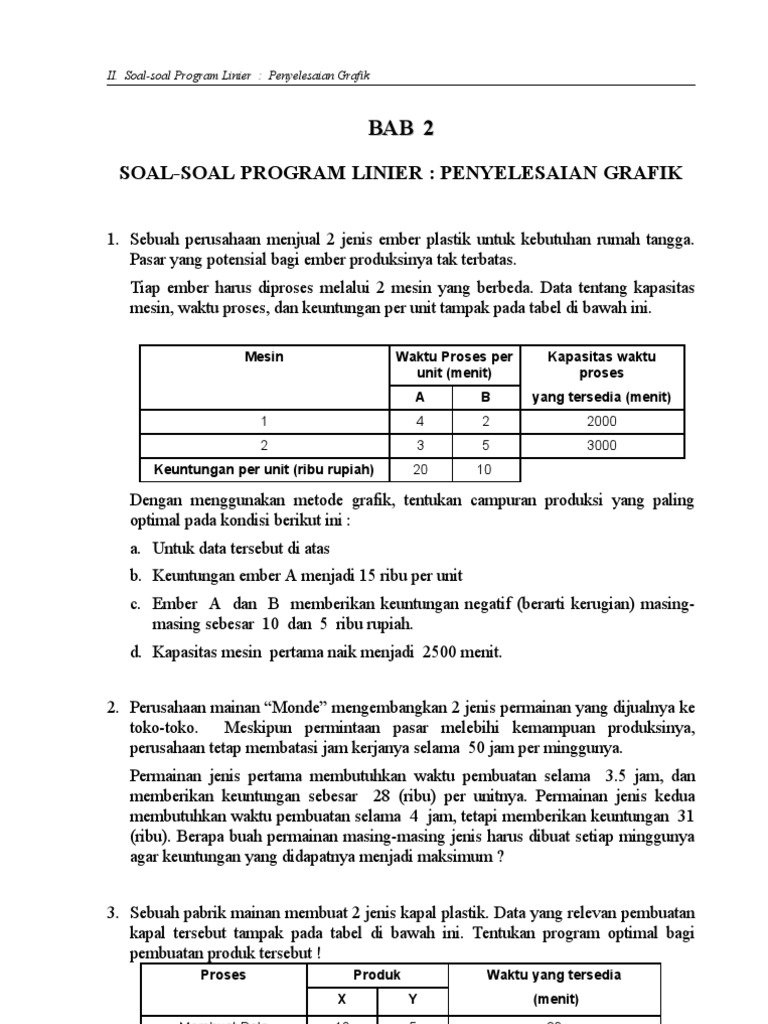Contoh soal dan jawaban riset operasi program linier. Untuk menyelesaikan soal cerita program linear dibutuhkan kemampuan analisis yang lebih tinggi dibanding soal program linear yang biasa. Daya tampung maksimum hanya 200 kendaraan. Biaya parkir mobil kecil rp 100000jam dan mobil besar rp 200000jam. Pertidaksamaan kuadrat dan himpunan penyelesaiannya. Pada mulanya riset operasi tidak terlepas dari perang dunia ke ii. Contoh soal cerita program linear dan pembahasan posted by edutafsi on 05 october 2014 1155 am.