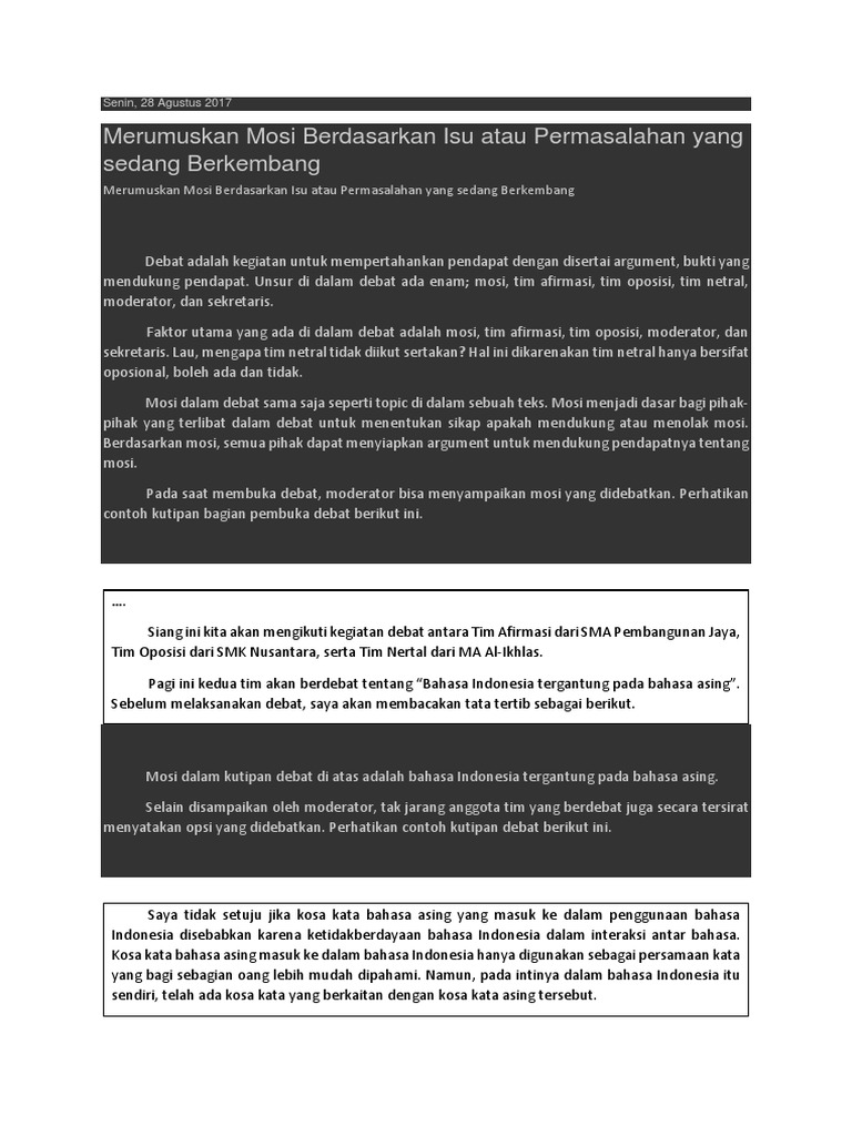 Contoh soal debat bahasa indonesia sma. Soal pilihan ganda bahasa indonesia teks negosiasi beserta jawabannya ada sekitar 50 butir soal pgpilihan ganda bahasa indonesia tentang teks negosiasi dan jawabannya yang bisa adik adik smasmk jadikan referensi dalam menghadapi ujian dari guru. Contoh soal pilihan ganda tentang debat dan jawabannya ada sekitar 80 butir soal pgpilihan gandapilgan bahasa indonesia tentang teks debat dan jawabannya yang bisa adik adik jadikan referensi dalam menghadapi ujian dari guru. Semoga selalu sehat ya pada kesempatan yang baik ini admin ingin berbagi contoh soal pg untuk mata pelajaran bahasa indonesia bagi adik adik yang sedang duduk dibangku kelas x smama beserta dengan kunci jawabnnyasoal yang admin bagikan tersedia 125 soal yang siap dijadikan sebagai. Berikut ini adalah 50 contoh soal pg tentang debat. Sma is a school in indonesia that focusing only in the knowlegde in their majoring. Contoh file soal uts lengkap kelas 1 6 sdmi semua mata pelajaran 20162017 berikut ini adalah kumpulan dari berbagi sumber tentang contoh soal try out bahasa indonesia sma dan kunci jawaban yang bisa gunakan untuk bank soaldownloadsd dan diunduh secara gratis dengan menekan tombol download biru dibawah ini.