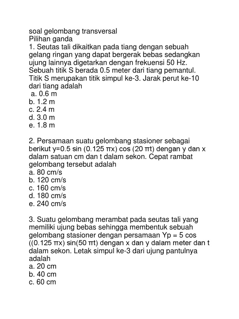 Gelombang transversal cepat rambat panjang gelombang frekuensi periode soal dan jawaban un 2013. Pengertian gelombang transversal gelombang transversal merupakan salah satu jenis gelombang yang diklasifikasikan berdasarkan arah rambatnya. Contoh contoh gelombang longitudinal ialah gelombang suara dan gelombang p seismik yang disebabkan oleh gempa dan ledakan. Seperti itulah pembahasan mengenai rumus gelombang transversal dan contoh soal gelombang transversal yang bisa penulis beriman kepada kalian para pembaca online dan para pelajar karena tidak bisa dipungkiri bahwa ulasan ini sama pentingnya dg materi fisika yg lain yakni contoh hukum newton di kehidupan sehari hari. Gelombang ini memiliki ciri dimana arah getar dan arah rambat saling tegak lurus. Satu gelombang bisa kita lihat dari panjangnya dg menghitung jarak antara lembah dg bukit atau bisa kalian lakukan dg cara menghitung jarak antara satu rapatan dg.