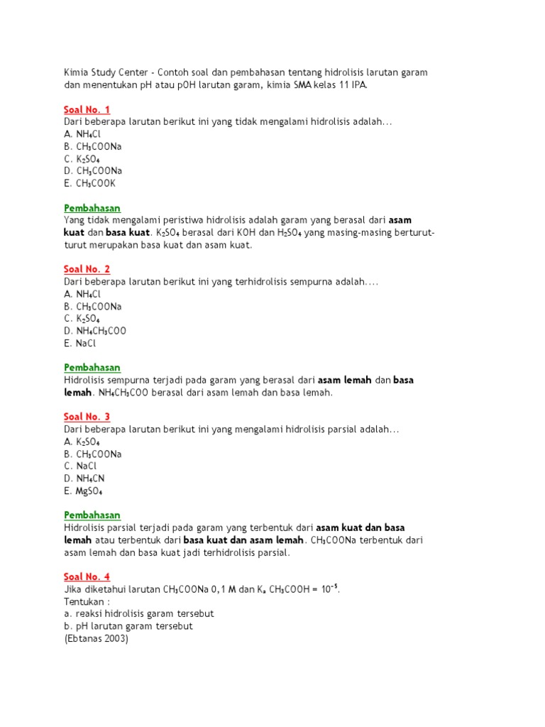 Jika kamu suka dengan soal hidrolisis garam dan pembahasan kamu bebas untuk melakukan share ke semua media sosialmu. Soal mencari ph hidrolisis garam ini mengambil beberapa aspek yang diketahui. Berikut contoh soal ulangan harian pelajaran kimia kelas xi ipa. Download contoh soal hidrolisis dalam bentuk pdf klik disini. 1 persamaan reaksi hidrolisis garam nh4cl.