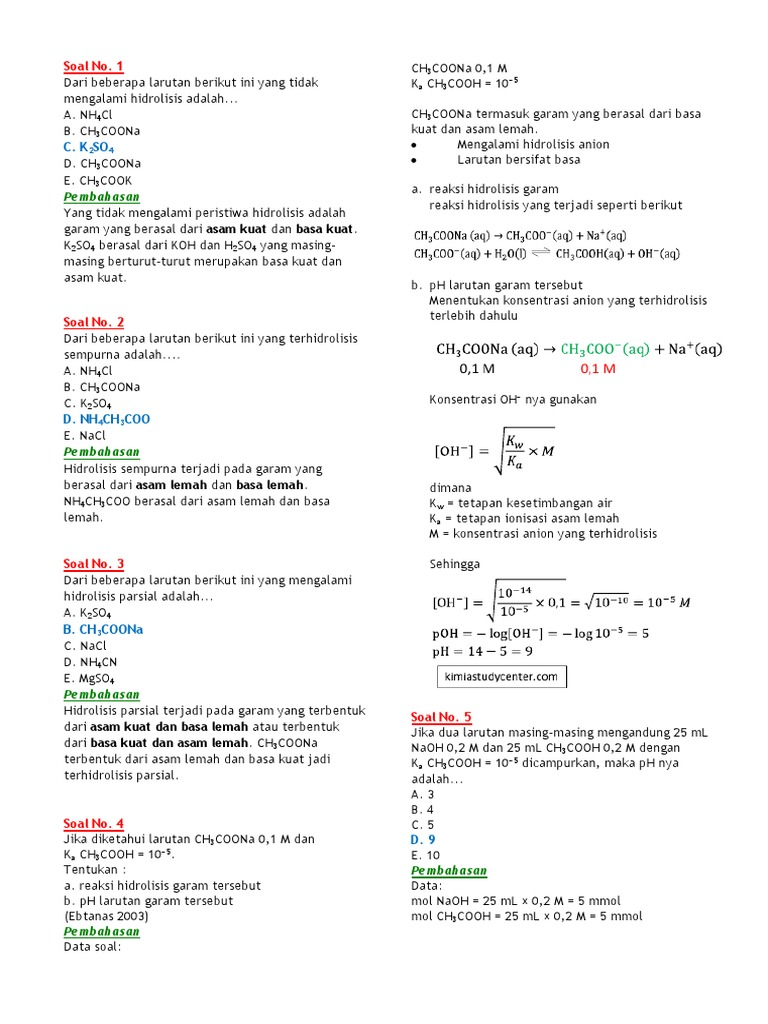 Contoh soal hidrolisis garam pilihan ganda serta pembahasannya di dalam air garam dapat terurai menjadi ion ionnya terionisasi. Ion ion itu ada yang bereaksi dengan air yaitu ion ion yang berasal dari asam lemah atau basa lemah. Larutan garam dapat bersifat netral asam ataupun basa. Hal ini dikarenakan terjadinya hidrolisis garam yaitu reaksi dari suatu kation atau suatu anion ataupun keduanya dengan air menghasilkan ion h aq atau. Download contoh soal hidrolisis dalam bentuk pdf klik disini. Hidrolisis garam pengantar.