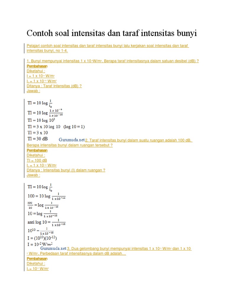 Contoh soal intensitas bunyi. 9 x 10 9 wm 2. P daya watt i intensitas bunyi wattm 2 dan a luas permukaan bola m 2 maka 6400π. Soal no1 sbmptn 2018. 8 x 10 9 wm 2 e. Contoh soal pembahasan gelombang bunyi kelas xi11. 30 db 10 9 wm 2.