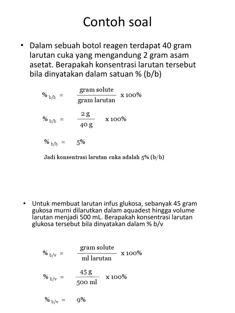 Terdapat beberapa satuan konsentrasi yaitu persentase massa persentase volume fraksi mol x molalitas m molaritas m. Konsentrasi larutan konsentrasi larutan menyatakan jumlah zat tertentu dalam suatu larutan atau pelarut. Harga zat h 1 s 32 dan o. Contoh soal konsentrasi larutan. Berapakah volume dari larutan h 2 so 4 2 m yang dibutuhkan untuk membuat larutan 200 ml h 2 so 4 05 m. Larutan tidak hanya berbentuk cair tetapi juga berbentuk gas dan padatcontoh larutan.