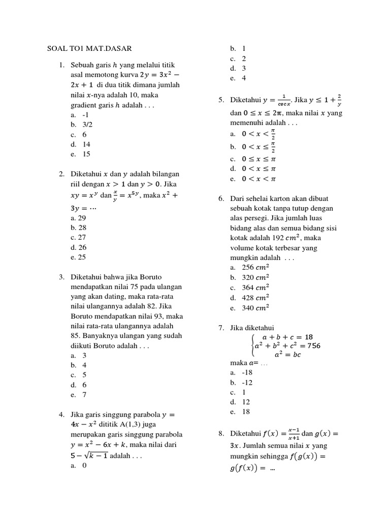 Contoh soal matematika dasar. M 2014m 2014 sehingga m1 2013m12013 dan m1 2015m1 2015. Prediksi soal tes psikotes lengkap dan jawabannya soal psikotes matematika dasar ini mirip dengan soal matematika smp yang dulu kita kerjakan sewaktu duduk dibangku sekolahan kali ini kita kembali lagi dijumpakan dengan soal seperti ini. Bagi anda yang membenci dan selalu menghindari makhluk bernama matematika ketika masa sekolah dulu mungkin bisa menjawabnya sendiri. Simak di sini untuk latihan utbk dan cara mengerjakannya. Kali ini kita akan belajar latihan dan pembahasan soal prediksi hots sbmptn matematika dasar. Untuk mengerjakan soal ini agar penulisan dan pemfaktoran lebih mudah dipahami kita gunakan pemisalan yaitu.