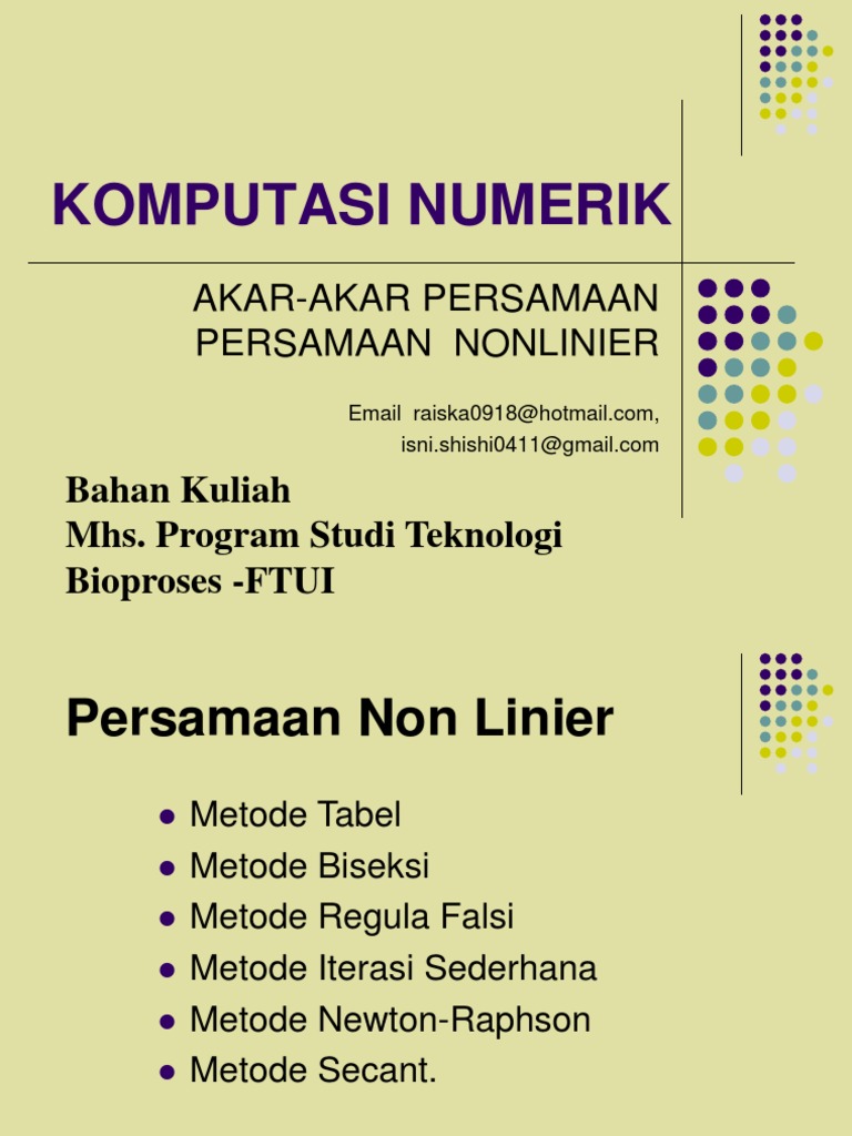 Contoh soal metode numerik biseksi dan penyelesaiannya. Pada sesi metode numerik ini akan kita bahas salah satu metode penyelesaian persamaan non linier yaitu. Hal ini dilakukan berulang ulang hingga diperoleh akar persamaan. Metode biseksi teori singkat metode biseksi ini membagi range menjadi 2 bagian dari dua bagian ini dipilih bagian mana yang mengandung dan bagian yang tdk mengandung akar dibuang. Pengertian metode numerik metode numerik merupakan teknik teknik yang digunakan untuk dapat memformulasikan masalah matematis supaya dapat dipecahkan dengan operasi perhitunganmetode numerik tersebut penting disebabkan karna mengajarkan untuk dapat memecahkan suatu kasus dengan memakai berbagai cara serta permodelan. Kom di susun oleh. Itulah berbagi kumpulan data terkait contoh soal metode numerik biseksi dan penyelesaiannya.