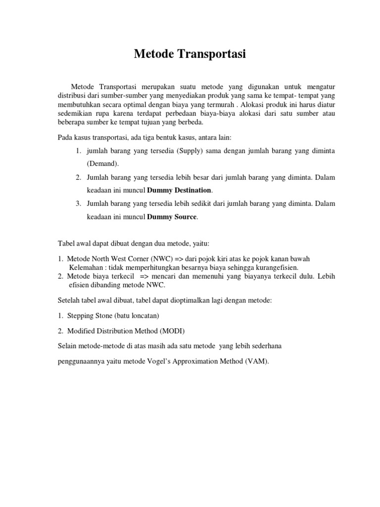 Biaya dalam permintaan dan kapasitas dalam unit. Dimana perusahaan tersebut memiliki 3 buah pabrik yang bertempat di pabrik a pabrik b pabrik c dengan tujuan kebutuhan konsumen adalah cilegon serang pandeglang. Contoh model transportasi dan penyelesaian dengan vam vogel approximation method dan stepping stone contoh. Solusi awal dengan metode inspeksi untuk masalah di atas. Jika sel terisi kurang dari mn 1 maka perlu ditambahkan sel dummy dengan alokasi sebanyak 0 pada sel yang kosong. Metode transportasi metode transportasi adalah suatu metode yang digunakan untuk mengatur distribusi dari sumber sumber yang menyediakan produk produk yang sama di tempat tempat yang membutuhkan.