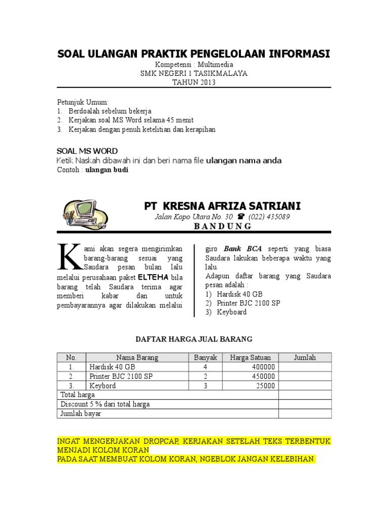 Microsoft word lanjutan lpk smensa informatika smk negeri 1 pati. Download contoh latihan soal praktek microsoft word selamat pagi kawan semua kali ini saya akan share sebuah latihan soal yang sangat mudah untuk temen temen mengembangkan kemampuan dasar tentang ms. Program aplikasi yang digunakan untuk pengolahan kata seperti membuat makalah surat skripsi disebut. Buat temen temen yang lagi belajar microsoft word latihan dasar ini sangat cocok sekali untuk tahap awal bagaimana kita mengenal lebih banyak lagi tentang microsoft word. Salah satu contoh system operasi dalam komputer adalah a. Salah satu contoh system operasi dalam komputer adalah a.