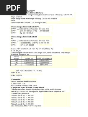 Internal rate of return irr 4. Selanjutnya selama 5 tahun berturut turut akan menerima hasil sebesar rp 150000000 rp 195000000 rp 195000000 rp 185000000 dan rp 175000000. Contoh soal perhitungan payback period pi irr npv contoh soal pt. Materi lengkap tentang rumus npv dan pengertian net present value cara hitung npv deposito serta beberapa contoh soal dan cara menghitung npv melalui excel. Contoh soal menghitung npv yang mudah dan benar pada hari ini upin mendapat pinjaman dari ipin sebanyak rp 100 juta yang ingin saya investasikan selama satu tahun. Irr berasal dari bahasa inggris internal rate of return disingkat irr yang merupakan indikator tingkat efisiensi dari suatu investasisuatu proyekinvestasi dapat dilakukan apabila laju pengembaliannya rate of return lebih besar daripada laju pengembalian apabila melakukan investasi di tempat lain bunga deposito bank reksadana dan lain lain.