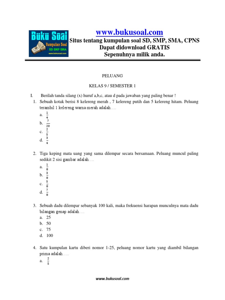 5 di sini ada kumpulan latihan prediksi dan tryout contoh soal un matematika smp kelas 9 dan pembahasannya bisa di download dalam pdf. 15 contoh soal dan pembahasan materi peluang kejadian matematika. Materi ini di berikann. Supaya lebih komplit admin akan kupas tuntas tentu saja semua contoh soal peluang dan pembahasannya kelas 9 sampai 11 baik berupa kejadian majemuk dan masih banyak lagi. Contoh soal dan pembahasan tentang peluang contoh soal dan pembahasan tentang peluang dadu contoh soal dan pembahasan tentang mata uang logam contoh soal dan pembahasan tentang. Yokogiru aldwin valentino simanjuntak.