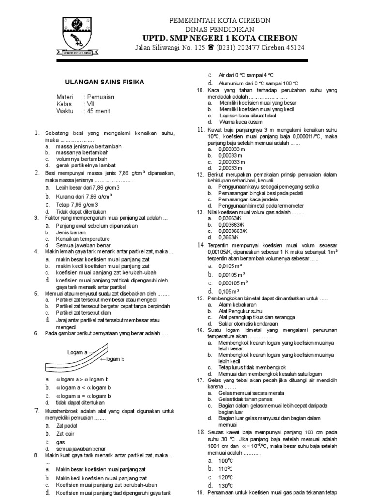 Contoh file download contoh soal uts semester 1 tahun 2015 untuk sd semua kelas berikut ini adalah kumpulan dari berbagi sumber tentang soal pemuaian kelas 7 yang bisa gunakan untuk administrasicontoh soal dan diunduh secara gratis dengan menekan tombol download biru dibawah ini. Contoh soal massa jenis dan pemuaian berikut ini merupakan contoh soal fisika untuk smp kelas 7.