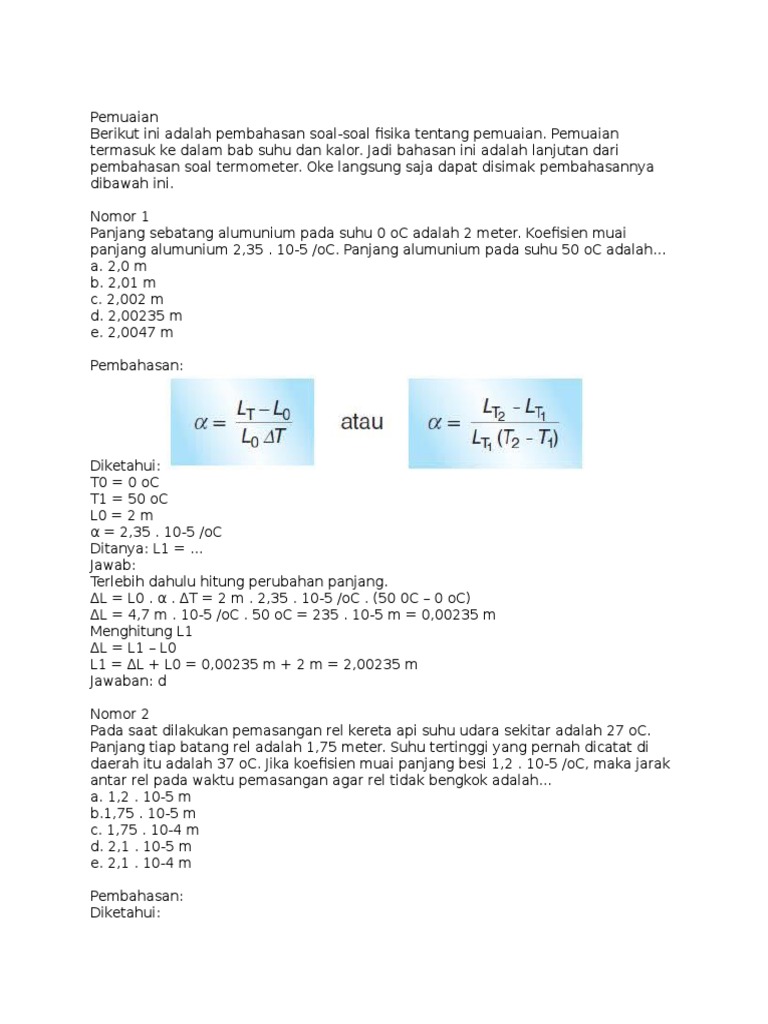 Koefisien muai panjang baja 10 5 o c 1pertambahan panjang baja dan panjang akhir baja pada suhu 70 o c adalah. 50 oc 235. Soal dan jawaban pemuaian smp kelas vii nomor 1. Nah pada kesempatan kali ini kita akan membahas tentang kumpulan contoh soal dan pembahasan tentang pemuaian panjang luas dan volume. Materi tentang suhu dan pemuaian kita pelajari pada tingkat smp maupun smu. Pertambahan panjang δl dan panjang.
