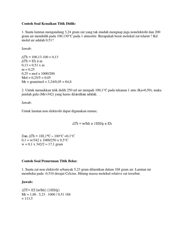 Jika m r urea 60 dan k f air 186 molal hitung titik beku larutan urea tersebut. Koligatif larutan bedakan menjadi dua jenis yaitu sifat larutan elektrolit dan non elektrolit dikareanakan zat yang terlarut di dalam larutan elektrolit bertambah jumlahnya karena terurai menjadi ion ion. Berikut ini adalah contoh soal dan bahasan dalam penurunan titik beku. Penurunan pada titik beku larutan ini yaitu 1550c. Contoh soal sifat koligatif larutan kenaikan titik didih.