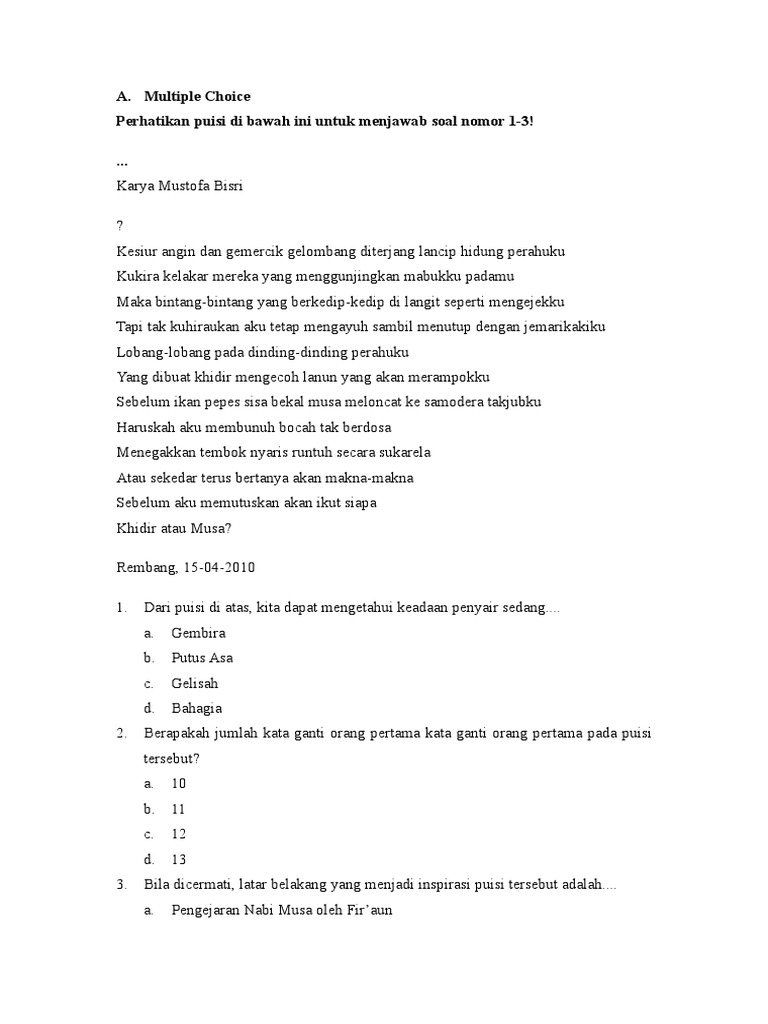 Contoh soal pilihan ganda tentang puisi beserta jawabannya. Dibawah ini adalah contoh soal puisi bahasa inggris yang akan memperdalam pemahaman kalian tentang puisi bahasa ingggris. Semakin dia berwawasan luas semakin sederhana dia seperti ranting padi dengan sebutir gandum. Untuk bagian ketujuh soal dimulai dari nomor 76. Sebagian asia sedangkan ke 3 pilihan lain adalah di asia tenggara yang tidak bisa. Contoh soal bahasa indonesia kelas 10 semester 1 dan 2 beserta jawabannya kurikulum 2013. Berisikan materi tentang antologi puisi bagian ke 7 tulisan yang sedang anda baca merupakan lanjutan soal bahasa indonesia kelas x semester 2 kurikulum 2013 pilihan ganda wajib bagian ke 6 soal nomor 61 75.