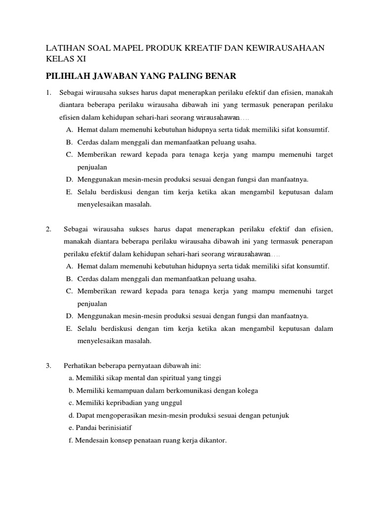 Contoh soal kewirausahaan kwu kelas 11 semester 1 dan semester 2 kurikulum 2013 untuk kisi kisi latihan soal uas materi terbaru. Tinjau pekerjaan anda sebelum mengirimnya ke penyelia. Soal dan jawaban mandiri kreatif dalam kewirausahaan 1. Soal kewirausahaan kwu kelas 11. Baca setiap pertanyaan dengan cermat. Soal 2 pilihan ganda produk kreatif dan kewirausahaan kelas xi aberilah tanda silang pada huruf abcdatau e di depan jawaban yang paling tepat.