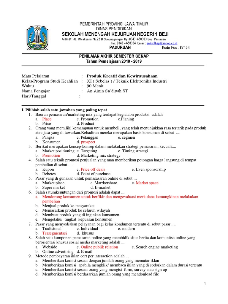 Contoh soal produk kreatif dan kewirausahaan kelas xi. Tulis nama anda di sudut kanan atas. By guru arrasyid posted on december 8 2019 june 14 2020. Yang bisa digunakan untuk melengkapi administarsi guru yang dapat di unduh secara gratis dengan menekan tombol download. Instruksi untuk berurusan dengan pertanyaan. Soal dan jawaban prakarya dan kewirausahaan kelas xi smk semua jurusan k13 1. 1sebagai seorang wirausahawanseseorang harus memiliki kepekaan dalam mengamati perubahan situasi dan kondisi lingkungan bisnisnyasituasi dan kondisi yang selalu berubah dalam masyarakat bagi seorang wirausahawan merupakan.