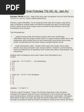 Contoh soal psikotes secaba tni ad. Titik garis kurva 3 garis sejajar kotak dua garis saling memotong dua garis terpisah 7 buah titik tersusun melengkung dan garis melengkung. Selain psikotes anda akan dipertemukan dengan tes seleksi wawancara. Contoh soal psikotes masuk tni ad tes psikologi phsicology test atau lebih sering disebut tes psikotest adalah salah satu tahap dalam proses rekrutmen karyawan pegawai misalnya bumn perbankan bank tni polri cpns dan mahasiswa atau akademisi universitas maupun perguruan tinggi selain itu psikotes sering digunakan oleh perusahaan swasta dan lainnya. Contoh soal psikotes secaba tni ad. Ulasan file dan info berikut ini adalah kumpulan dari berbagi sumber tentang contoh soal psikotes secaba tni ad yang bisa bapakibu gunakan dan diunduh secara gratis dengan menekan tombol download biru dibawah ini. Nah gan kali ini fajriloveyura mau posting soal2 psikotest bagi kawan2 yang mau daftar tni polisi dan kerja.