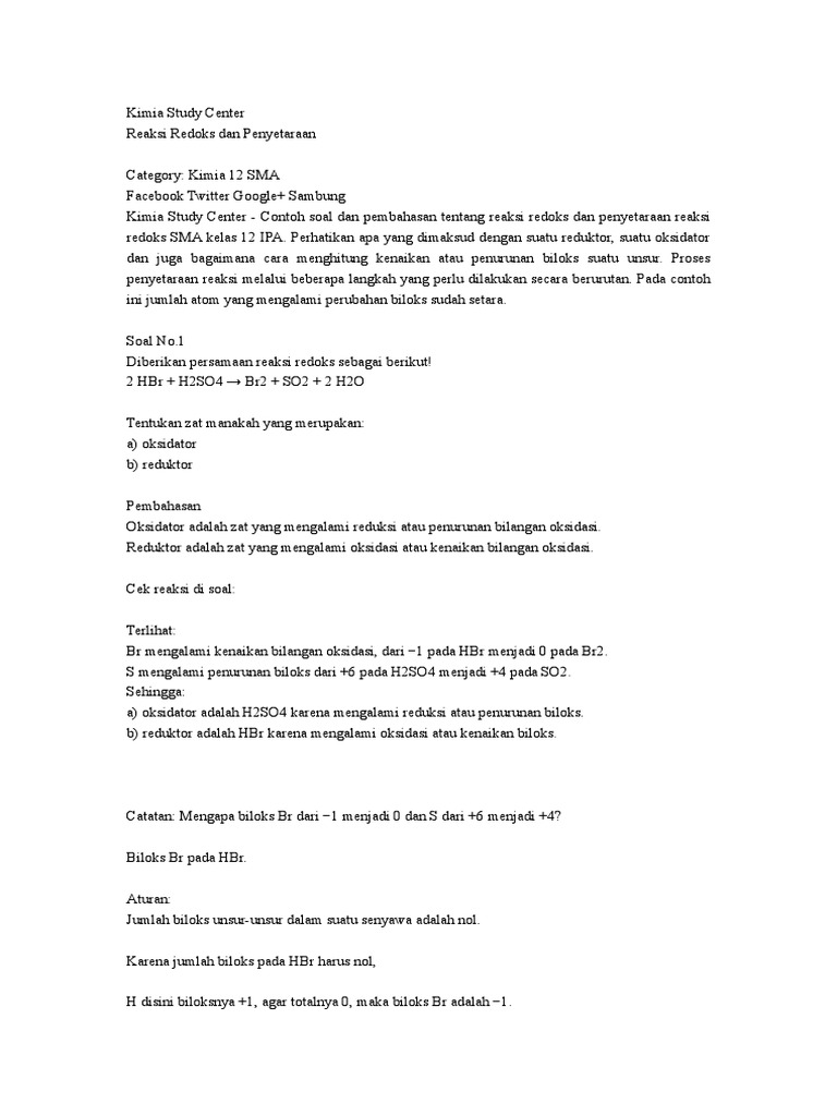 Contoh soal penyetaraan reaksi redoks dan jawaban kelas 12 sma reaksi redoks merupakan reaksi yang melibatkan reaksi reduksi dan reaksi oksidasi. Pengertian larutan elektrolit contoh dan ciri ciri. 20 contoh soal ipa kelas 8 tentang getaran dan gelombang beserta pembahasannya. Suatu reaksi oksidasi biasanya disertai dengan reaksi reduksi sehingga lazim disebut reaksi redoks. Di antara reaksi reaksi tersebut di bawah ini yang merupakan contoh reaksi redoks adalah. Kimia soal redoks dan pembahasannya.