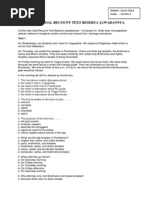 Sebagaimana disampaikan diatas bahwasanya soal soal yang ditanyakan setelah membaca reading comprehension itu ada banyak macam dan jenisnya. Kumpulan contoh soal recount text tentang biograpphy beserta jawaban. Kumpulan soal recount text beserta kunci jawaban terbaru buat sahabat sbi yang ingin mencari bahan soal recount text untuk latihan. Last holiday my students and i went to jogjakarta. Kumpulan soal recount text berikut ini saya kumpulkan dari berbagai naskah soal un bahasa inggris sma. Contoh soal recount text ini berkaitan dengan soal historical recount text bisa bertema recount text peristiwa bersejarah di indonesia dan juga bisa pula bertema peristiwa bersejarah di dunia.