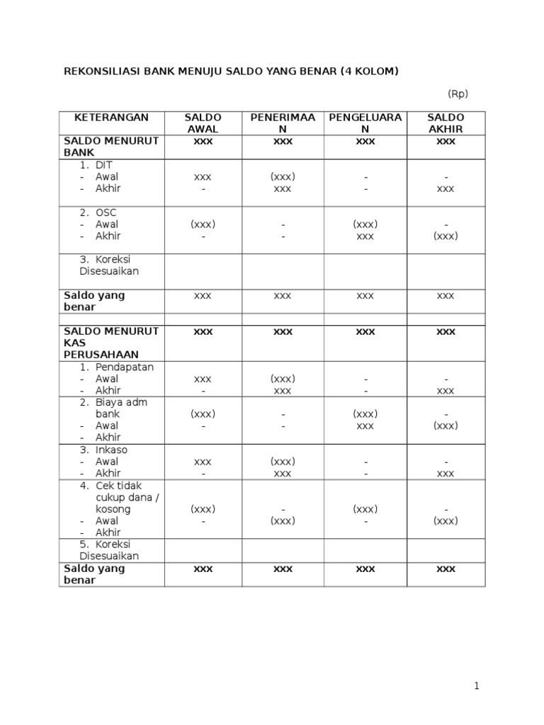 Contoh soal rekonsiliasi bank 4 kolom. Contoh soal dan penyelesaian rekonsiliasi bank 2 kolom pt adi jaya merupakan perusahaan yang bergerak dibidang perdagangan. Ada dua contoh yang akan saya sajikan yaitu contoh rekonsiliasi bank 4 kolom dan contoh soal rekonsiliasi bank 8 kolom. Bima yang menunjukan saldo sebesar rp1550000. Ada 3 langkah untuk melakukan rekonsiliasi bank baik menggunakan metode rekonsiliasi bank 4 kolom maupun 8 kolom yaitu. Membuat perbandingan antara catatan kas perusahaan dengan laporan bank. Deposite in transit dit cek dalam perjalanan.