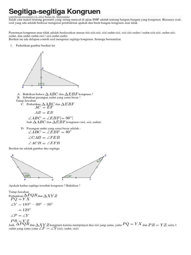 Cara kedua namun diingat hanya untuk tipe soal seperti ini saja jadi titik e dan f nya di tengah tengah jangan gunakan untuk tipe soal yang lain. Berikut akan kami berikan contoh soal sekaligus pembahasannya mengenai kongruen dan kesebangunan. Dua segitiga yang kongruen. Pasangan segitiga yang kongruen bce kongruen dengan bae ced kongruen dengan aed bcd kongruen dengan bad. Abc kongruen dengan pqr. Kesebangunan adalah suatu bangun datar yang mana sudut sudutnya memiliki kesesuaian yang sama besarnya serta panjang sisi sisi sudutnya bersesuai yang memiliki sebuah perbandingan yang sama.