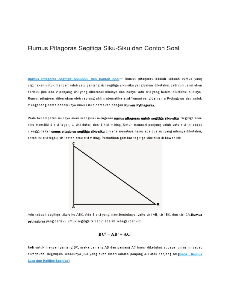 Kuadrat hipotenusa yaitu jumlah dari kuadrat dua sisi lainnya. Perbandingan trigonometri dari suatu sudut pad asegitiga siku siku. Secara sistematis teorema pythagoras dapat dinyatakan sebagai berikut. Sebuah segitiga abc adalah segitiga siku siku dengan sudut siku sikunya berada di titik a. Segitiga siku siku yaitu segitiga dengan salah satu sudutnya adalah. Ab 8 cm ac 6 cm.
