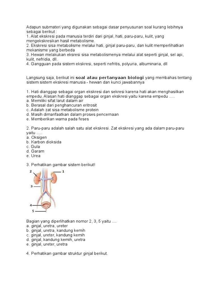 Pengetahuan anda akan bertambah dengan menyimak soal dan jawaban sistem pernapasan pada manusia seperti berikut ini. Soal sistem eksresi manusia ini berbentuk pilihan ganda dan berjumlah 20 butir soal. Sesuai dengan judulnya dalam latihan soal ini berbentuk pilihan gandapilgan multiple choice yang diengkap dengan kunci jawaban. Contoh soal sistem ekskresi manusia dan kunci jawabannya. Perhatikan gambar penampang ginjal berikut. Di dalam memahami materi sistem ekskresi manusia berikut ini contoh soal sistem ekskresi manusia dan kunci jawabannya.