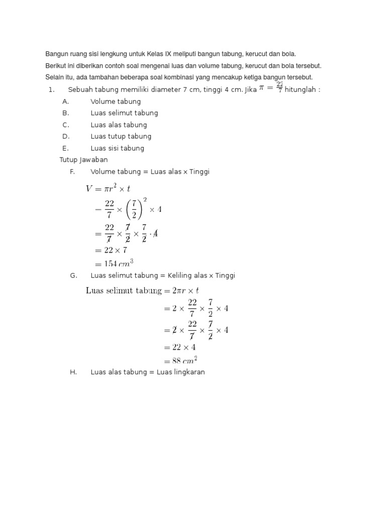 Contoh soal tabung dan jawabannya. Andi memasukkan 6 buah bola besi yang masing masing memiliki jari jari 7 cm hingga sebagian air tumpah dari tabung. Contoh soal volume tabung. Volume balok luas alas x tinggi volume balok p x l x t. Dan berikut ini adalah rumus volume bangun ruang lengkap disertai dengan contoh soal dan jawabannya. Contoh soal himpunan dan penyelesaiannya beserta jawabannya by azzahra rahmah posted on january 9 2020 rumuscoid pada kesempatan kali ini kita akan membahas mengenai contoh soal tentang himpunan dan pada kesempatan sebelumnya kita juga telah membahas tentang contoh soal aljabar nah untuk saat ini materi lengkap tentang contoh soal mengenai aljabar. Dalam pembahasan tersebut dipaparkan tentang rumus volume dan luas permukaannya juga tentang jaring jaring diagonal ruang dan diagonal sisinya.