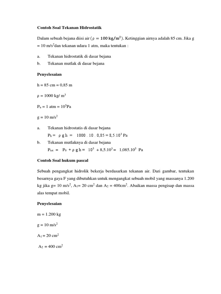 Tenang kamu akan segera mempelajari contoh soal tekanan hidrostatis sma kelas 11 dengan menyimak ulasan di bawah ini. Agar lebih dapat mudah di pahami berikut beberapa contoh soal tekanan hidrostatis beserta pembahasannya. Soal no 1seekor ikan sedang berenang diakuarium. Hal utama yang mempengaruhi tekanan hidrostatis di suatu tempat diantaranya yaitu kedalaman massa jenis zat cair tersebut dan gaya gravitasi pada tempat tersebut. Karena tekanan yang menekan keluar di dalam tubuh sama dengan tekanan atmosfer yang menekan tubuh maka kita tidak merasakan adanya tekanan atmosfer yang senantiasa menekan tubuh kita. Besarnya tekanan hidrostatis zat cair dapat dipengaruhi oleh beberapa faktor yaitu kedalaman massa jenis zat cair dan percepatan gravitasi.