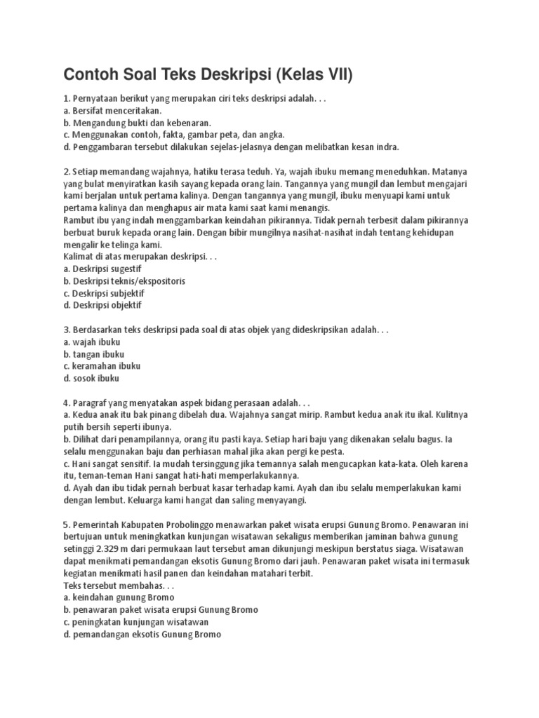 Contoh soal teks deskripsi kelas 7. Batas pagar mushola hanya berselang sekitar 3 meter. Semoga contoh soal yang admin bagikan kali ini bermanfaat buat peserta didik dan dapat membantu kalian dalam mencari referensi soal soal terbaru seputar teks deskripsi di kelas 7. Begitu pula pada teks deskripsi yang umumnya digunakan untuk menggambarkan suatu hal. Contoh soal teks deskripsi kelas vii loading. Contoh teks deskripsi terdapat berbagai jenis teks yang sering kita jumpai seperti narasi prosedur eksposisi laporan dan deskripsi. Semua jenis teks tersebut memiliki ciri ciri kaidah penulisan fungsi dan cara membuat yang berbeda beda.
