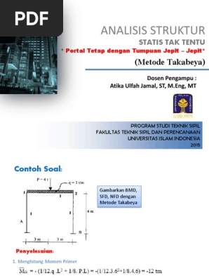 Tumpuan jepit dapat memberikan reaksi atau tahan terhadap gaya horizontal vertikal dan bahkan mampu memberikan reaksi terhadap putaran momen. Tumpuan juga dikatakan dengan landasan dimana sebuah balok akan diletakkan kepadanya. Contoh soal reaksi tumpuan jepit dalam menghitung reaksi struktur dengan tumpuan jepit kita harus memproyeksikan semua gaya terhadap titik tumpuannya. Seperti yang kita bahas pada kata pengantar statika 1. Contoh soal berikut merupakan balok dengan tumpuan jepit atau disebut balok katilever dengan bentang 10 m dan beban terpusat di tengah bentang sebesar p 100 kn. Gambar 6 reaksi tumpuan jepit tumpuan jepit merupakan tumpuan yang memiliki 3 variable atau tiga reaksi untuk menahan gaya atau aksi yang yang terjadi.