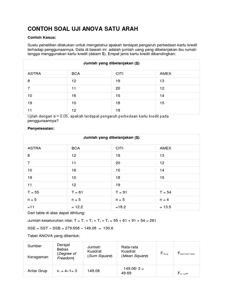 Bab 6 uji beda. Pengertian dan contoh soal uji anova satu arah 4 min read may 2 2020 anova satu arah one way anova seperti yang dijelaskan sebelumnya bahwa analysis of variance atau anova merupakan salah satu metode analisis statistika yang digolongkan ke dalam kelompok statistik inferensial. Bab 5 uji hipotesis. Membandingkan satu rata rata populasi dengan satu rata rata. Uji hipotesis dengan anova analysis of variance i. Contoh soal tentang anava satu arah one way anava tiga kelompok subyek penelitian untuk menguji metode pengajaran mana yang paling baik.