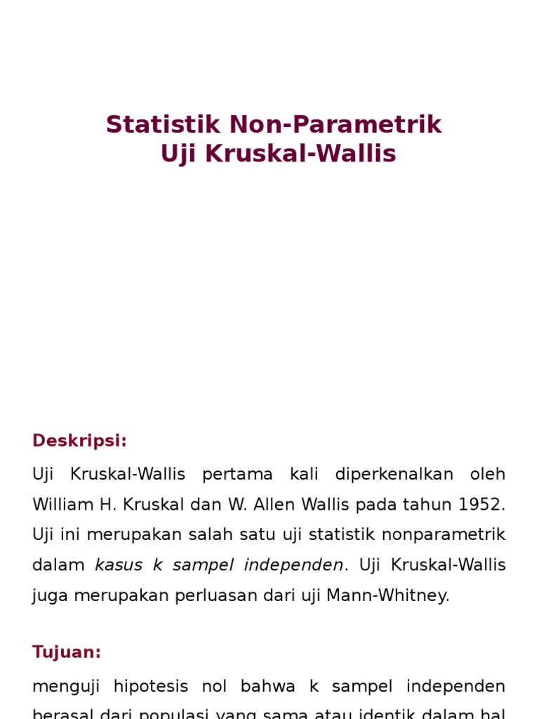 Ranking semua observasi observasi. Sedangkan jika kita punya lebih dari dua grup maka penting untuk mengetahui grup mana yang berbeda. Jika nilai uji kruskal wallis lebih kecil daripada nilai chi kuadrat tabel maka hipotesis null diterima berarti sampel berasal dari populasi yang sama demikian pula sebaliknya. Sebagai contoh angka 4005 pada baris 1 di atas menyatakan bahwa sampel nomor 1 lampu merek a mempunyai masa hidup 4005 jam. Mayulianto uji ini digunakan untuk membandingkan dua atau lebih populasi dengan data berbentuk ranking atau data kuantitatif namun asumsi kenormalan tidak terpenuhi dan sampel independen. Statistik uji kruskal wallis menggunakan nilai distribusi chi kuadrat dengan derajat bebas adalah k 1 dengan jumlah sample harus lebih dari 5.